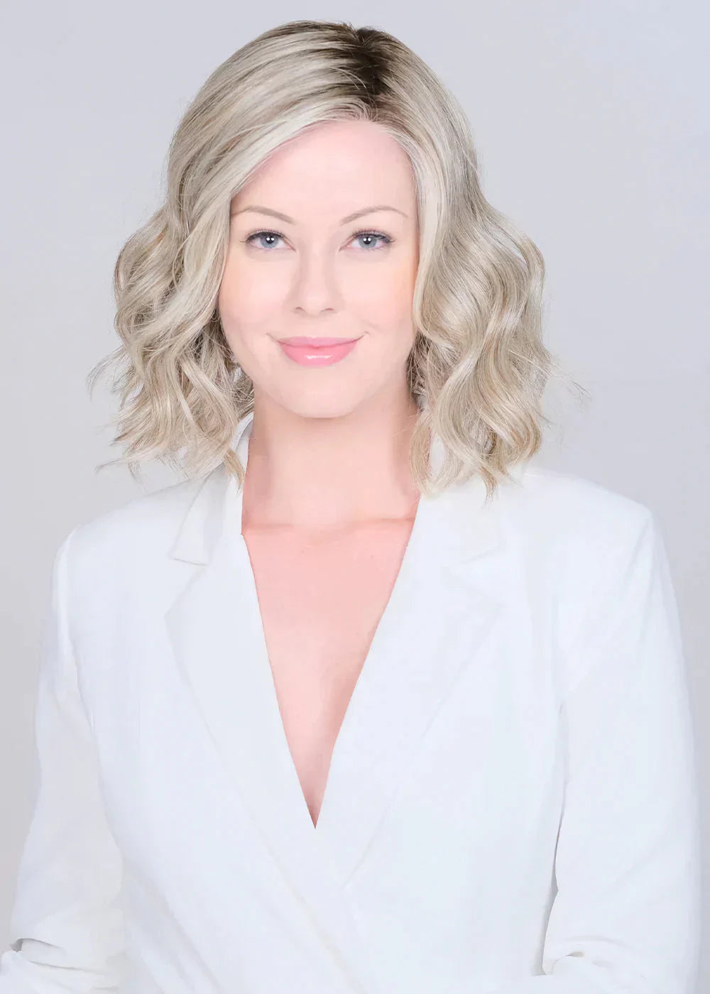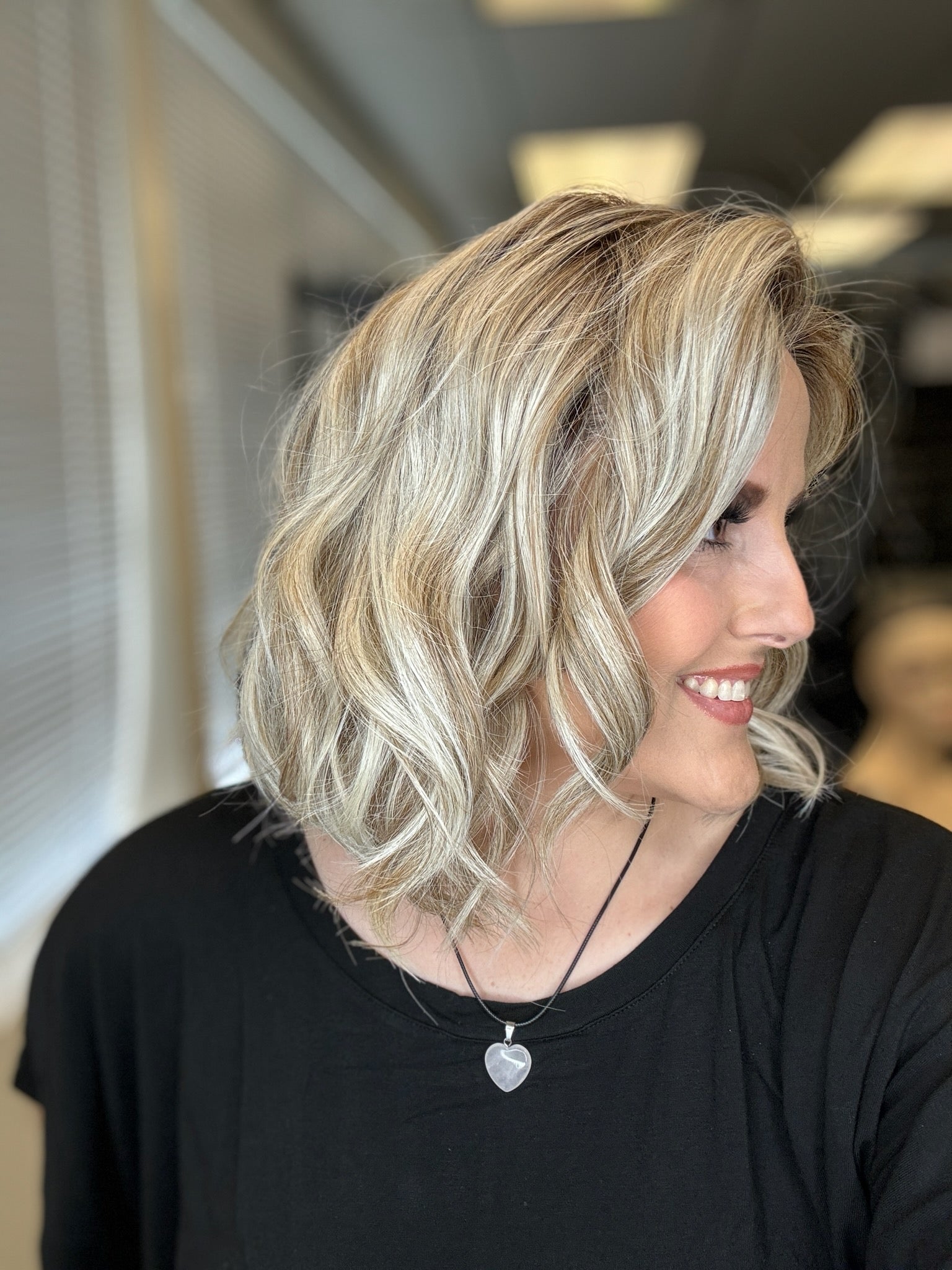 The proprietary knotting method is applied for a natural contour and off-the-face styling. Slightly extended lengths toward the front and shorter blunt cut in the back create an edgy attitude.