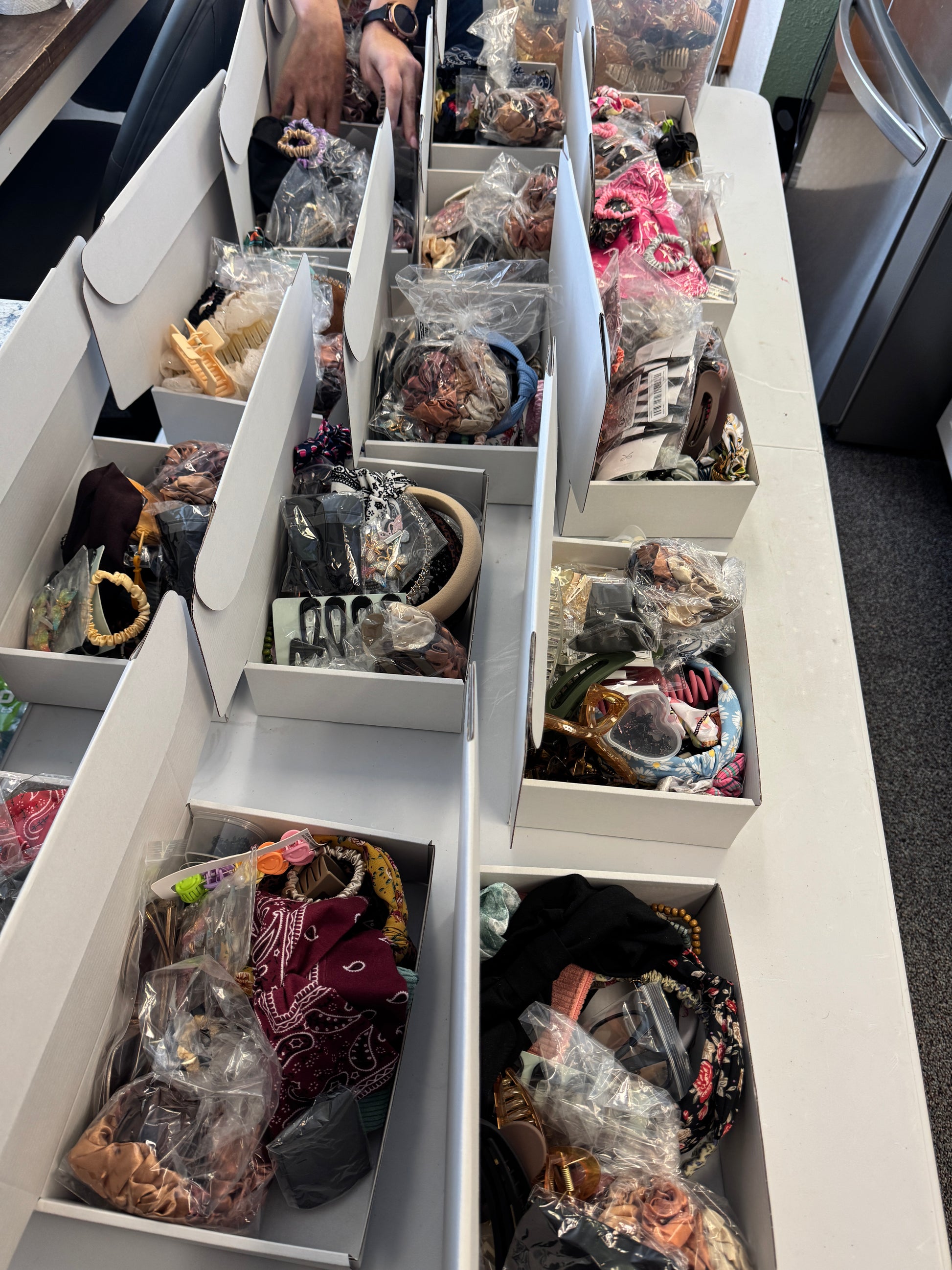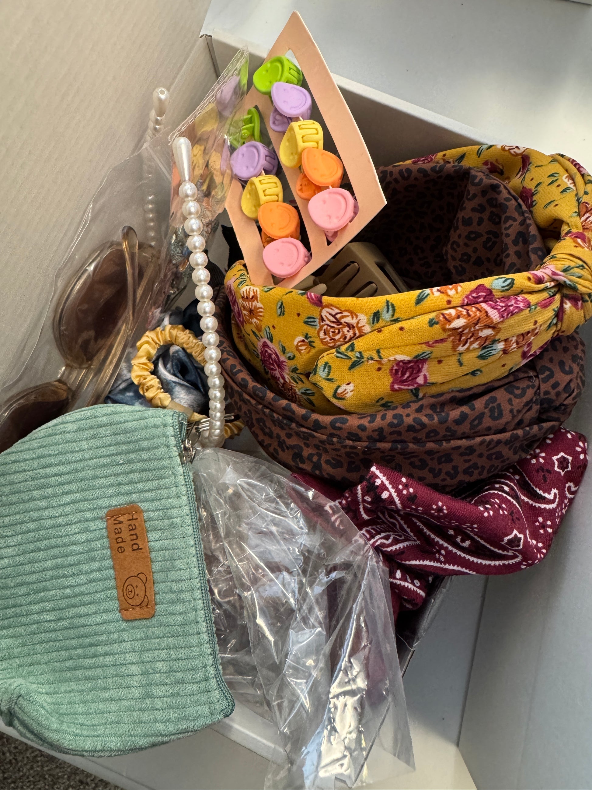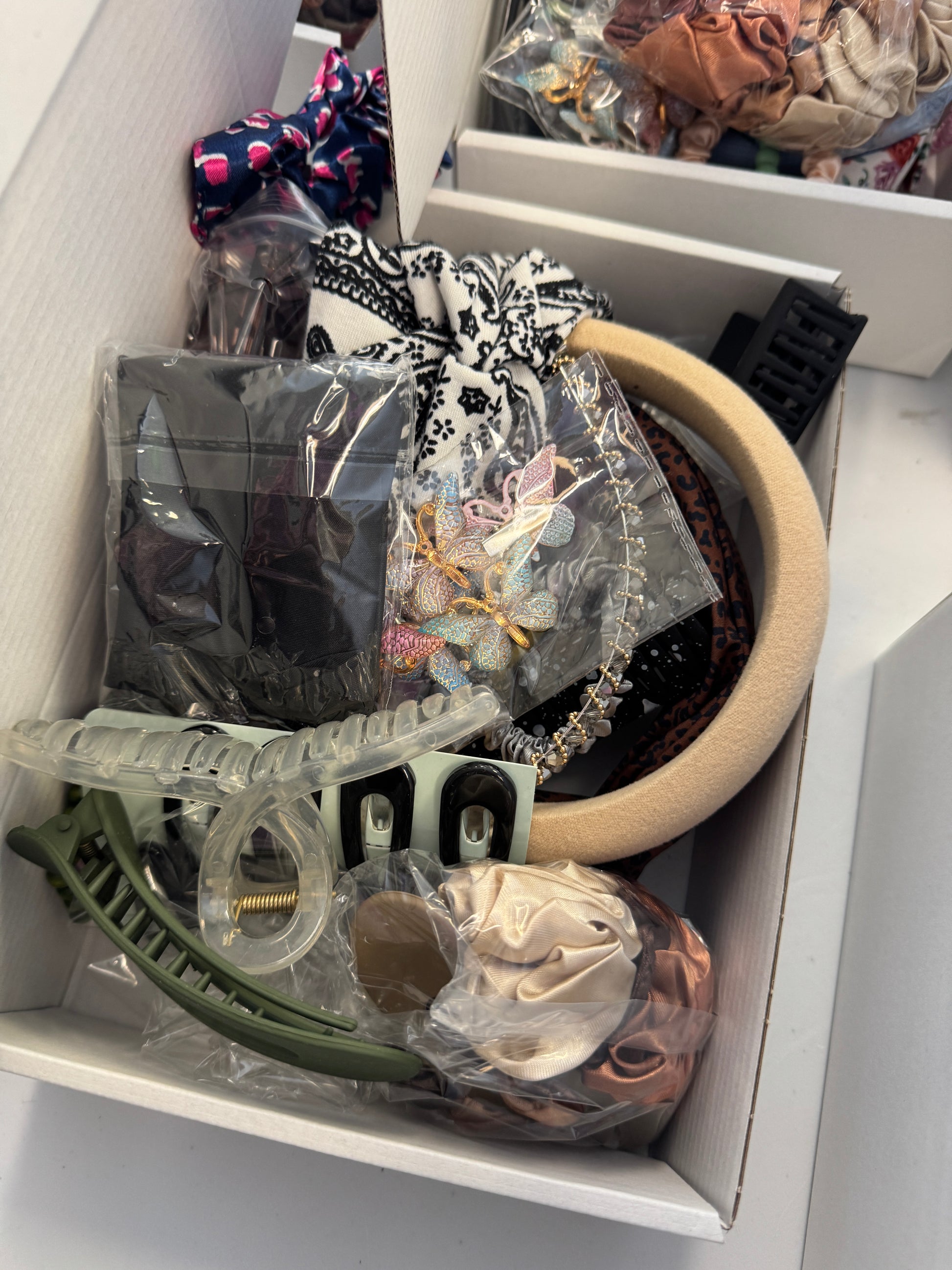 Keep for yourself or save for holiday gifts!! These boxes are jammed packed with headbands, hair clips, scrunchies, barrettes, a pair of sunglasses, bracelets and more! Each box is different.